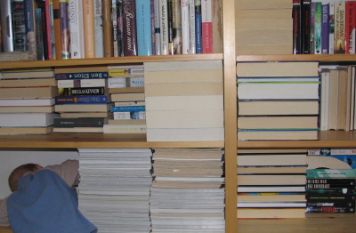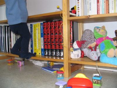 Vanhempien poikien (vm. -93, -95) kohdalla teimme yksinkertaisesti niin, että kun nämä oppivat konttaamaan, seisomaan ja lopulta kiipeämään, me vain tyhjensimme hyllyjä sitä mukaa alhaalta päin. Nyt kirjahyllyjä on niin monta, niin monessa huoneessa ja molemmissa kerroksissa, ettei se enää onnistu. Kaksosten kohdalla tyyli onkin toinen: kirjat puserretaan hyllyihin niin tiiviiksi riveiksi, ettei niitä saa hohtimillakaan ulos.