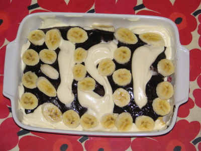 Yllä näkyvä eilinen isänpäiväkakku on poikkeuksellisesti kuorrutettu suklaalla. Yleensä esikoispoikamme, jonka velvollisuuksiin (ja iloihin) kakunteko nykyään kuuluu, käyttää päällystystyöhön marjoja, toisinaan suklaanappeja tai englanninrakeita. Pellillä uunitetun kakkupohjan puolikkaiden välissä on mm. hilloa ja persikanlohkoja. Kokonaisuus on vuollettu kuohutetulla vaniljakastikkeella.