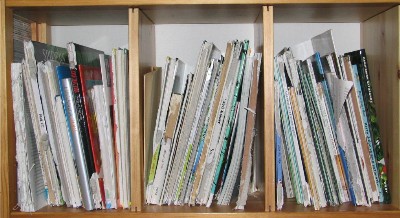 Niin luulisi. Varsinkin kaksospoikamme (ks. kuvat) hallitsee kyllä eri tekniikat. Ensin lisäsin tiivistystä, mutta kun se ei auttanut, käänsin kovakantiset kirjat selkä seinään päin. Nykyään hän osaa vetää kirjoja takapuolelta ulos. Niitä pitääkin pinota jo kasoiksi, ja niiden täytyy olla täsmälleen saman kokoisia. Samoin hyllyjen pystytikasten viereen täytyy kasata estokasoja, ja tässä varsinkin kiiltäväpaperiset lehdet (Graphis, Wallpaper ja vaimon hammaslääkärilehdet) ovat omiaan, jotta poika ei kiipeilisi ylöspäin. No, viimeksi tänään hän roikkui jalat kolmannessa hyllyssä.